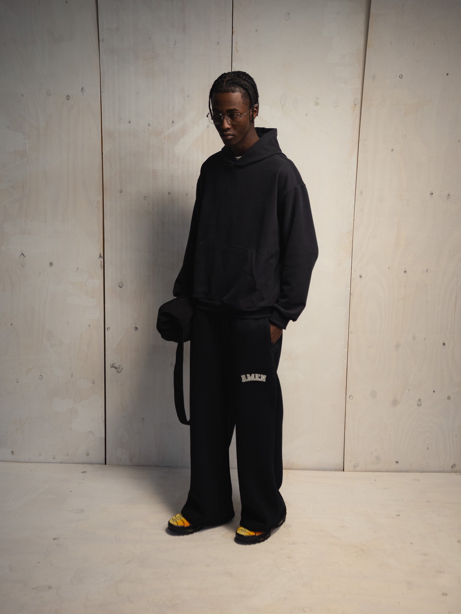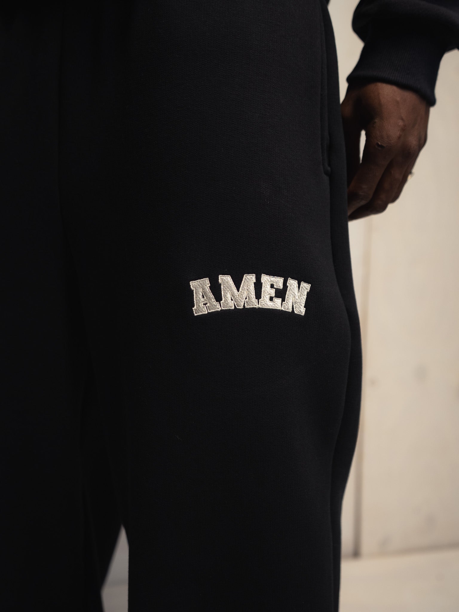 Made from premium, 100% cotton, 360GSM, black fleece with side pockets. These pants are incredibly soft and have a baggy fit. They feature an embroidered Amen graphic on the front.