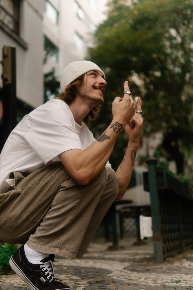 As peças são oversized. Recomendamos que você pegue o seu tamanho para que fique um look oversized/mais largo ou um tamanho abaixo para que fique normal no corpo.