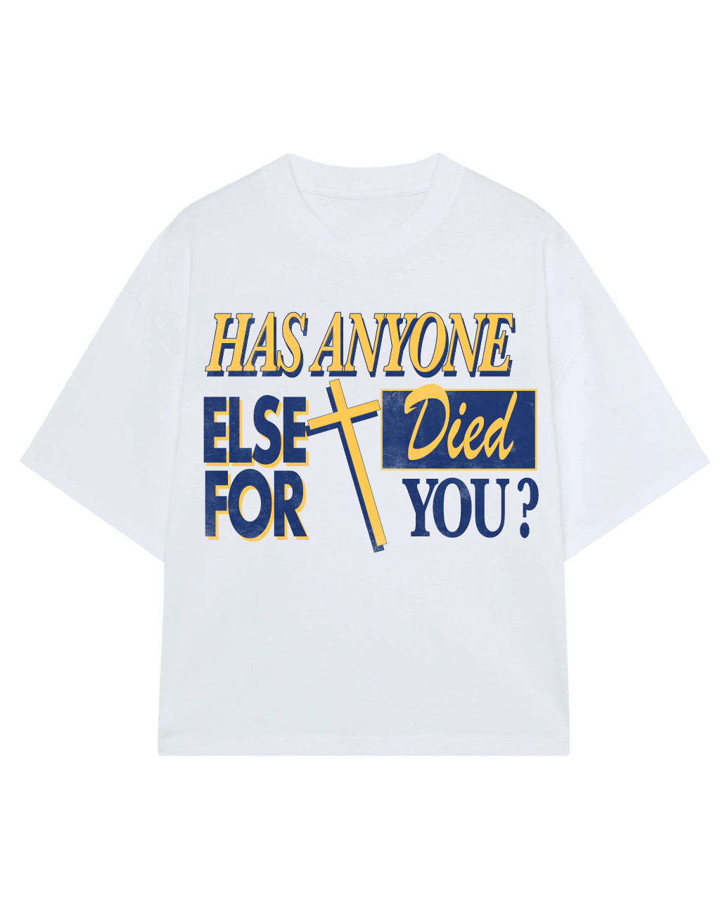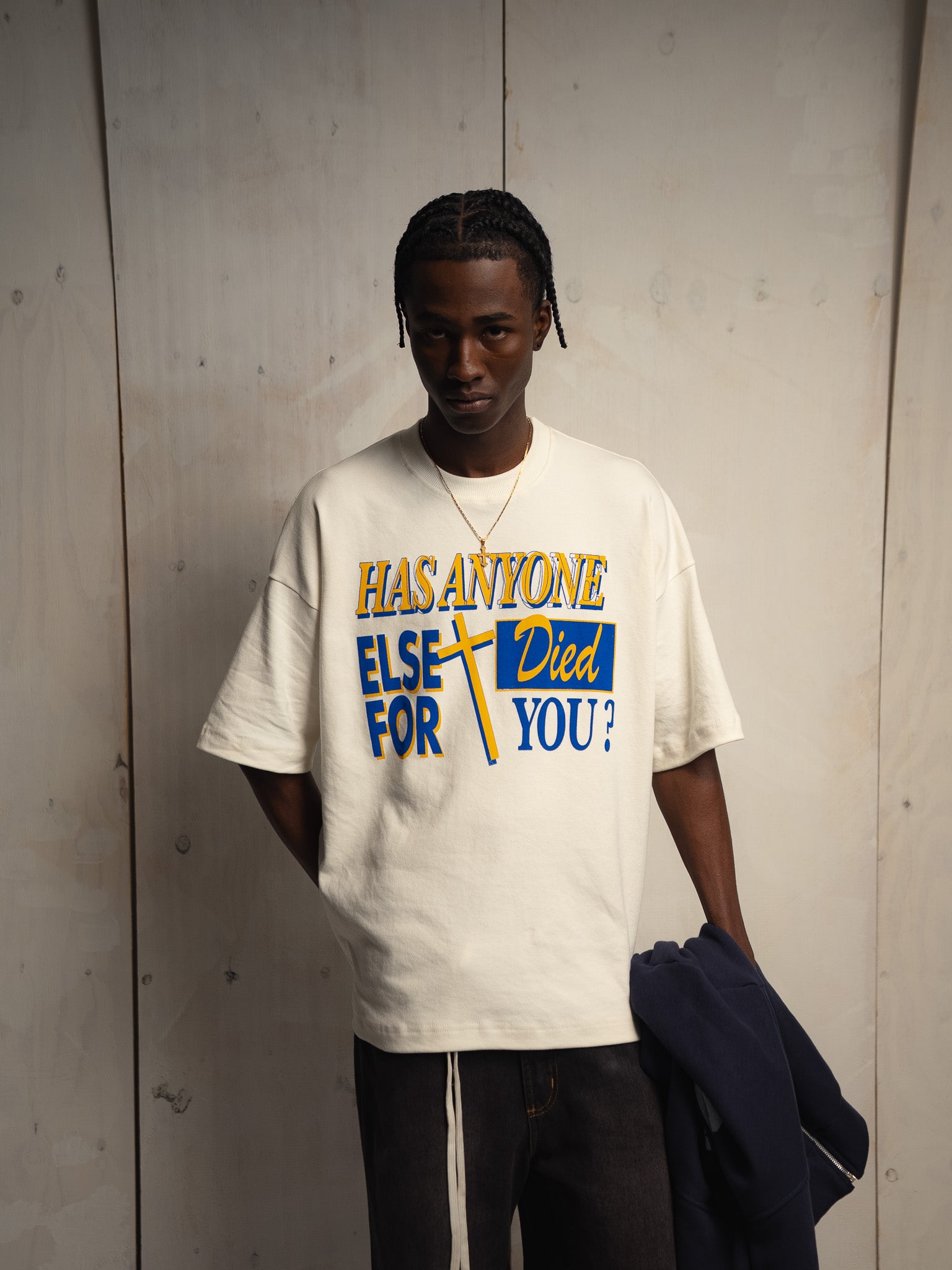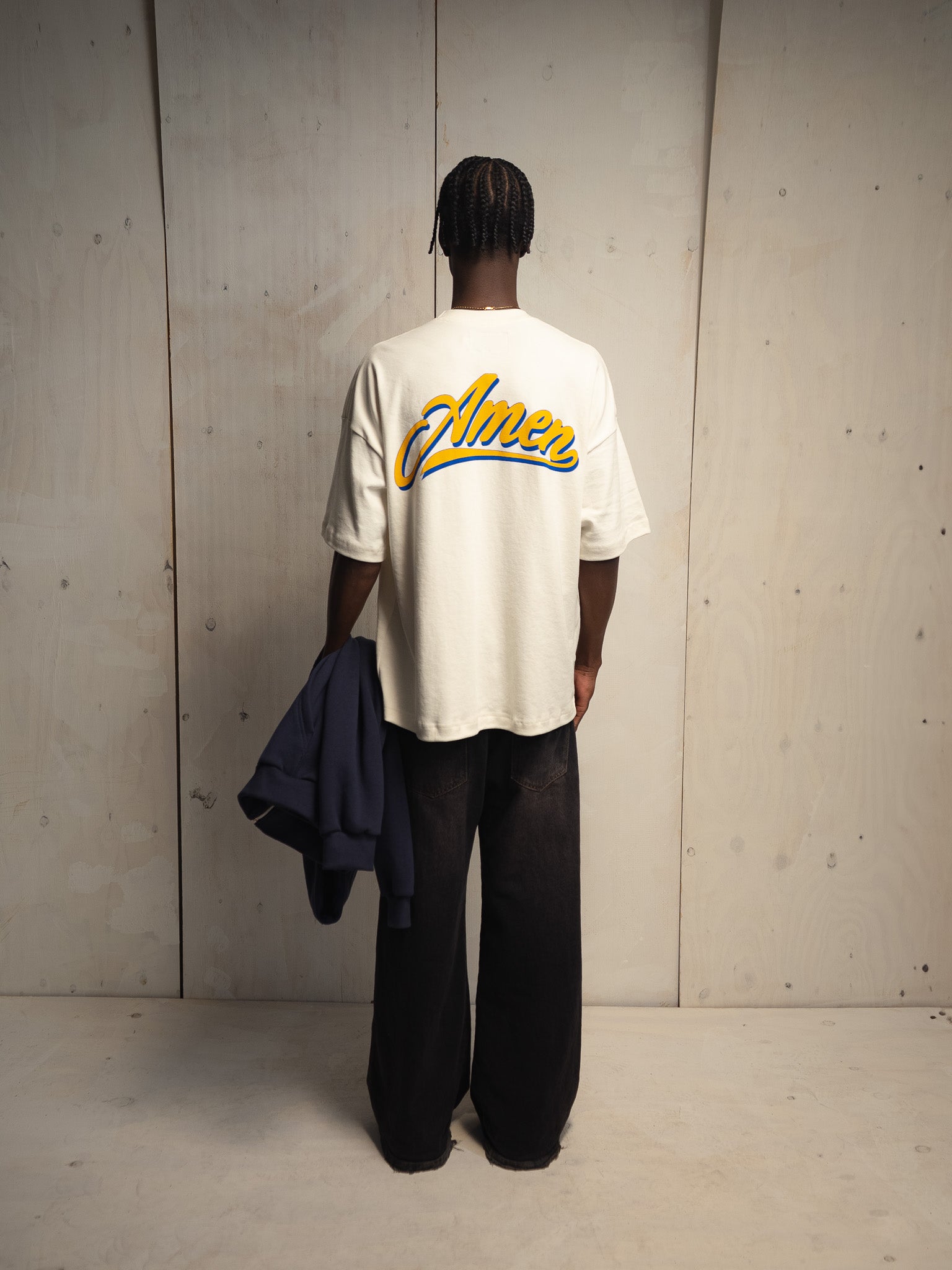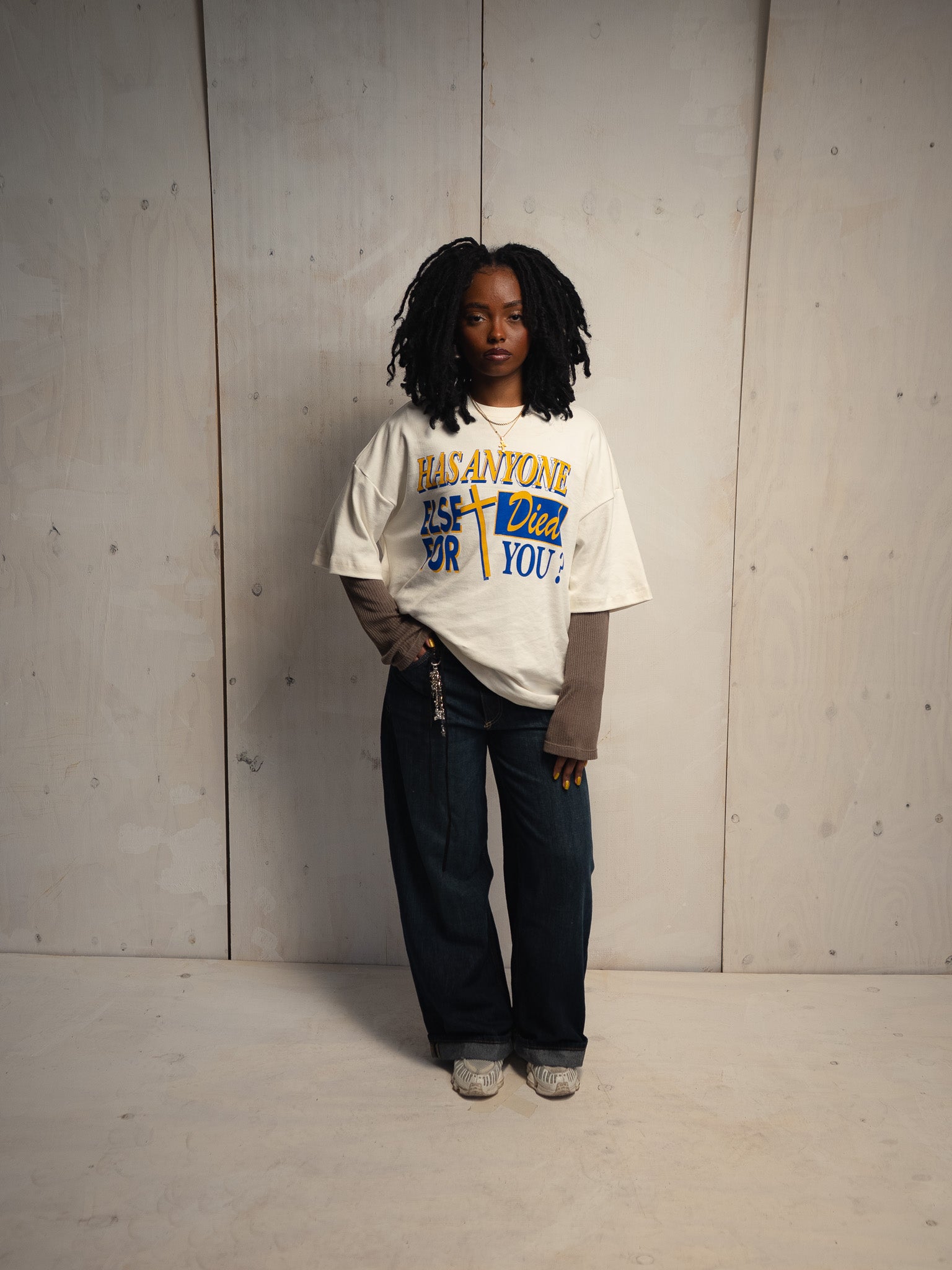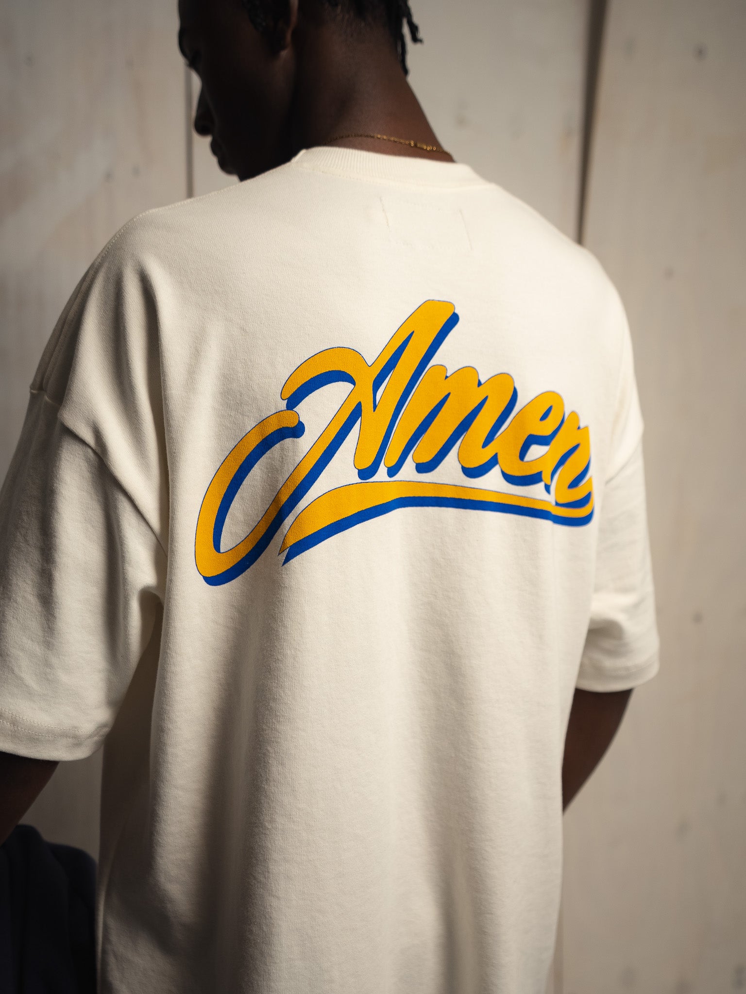 The Has Anyone Else T-shirt is made from premium, pre-shrunk 100% cotton suede with a heavy weight of 230GSM, with a soft touch. It features an oversized Amen-style fit, wider sleeves, and a 3cm collar. It features a silkscreen print on the front and back with distressing and techniques. for a vintage effect.