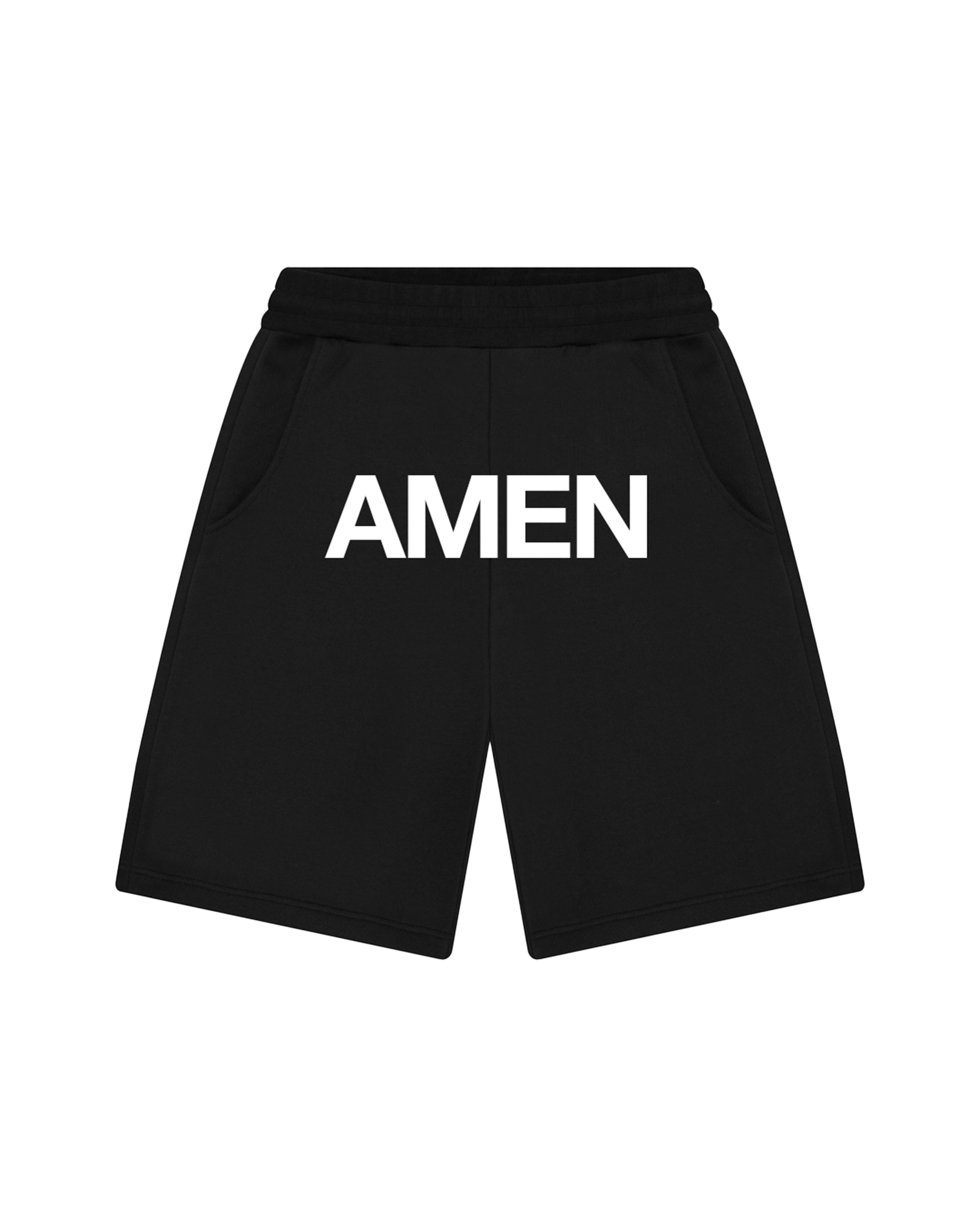 Black jorts with an adjustable elastic waistband and drawstring. Front pockets and a back pocket. Made from soft, heavyweight sweatshirt fabric, without terry, making it lighter and cooler.