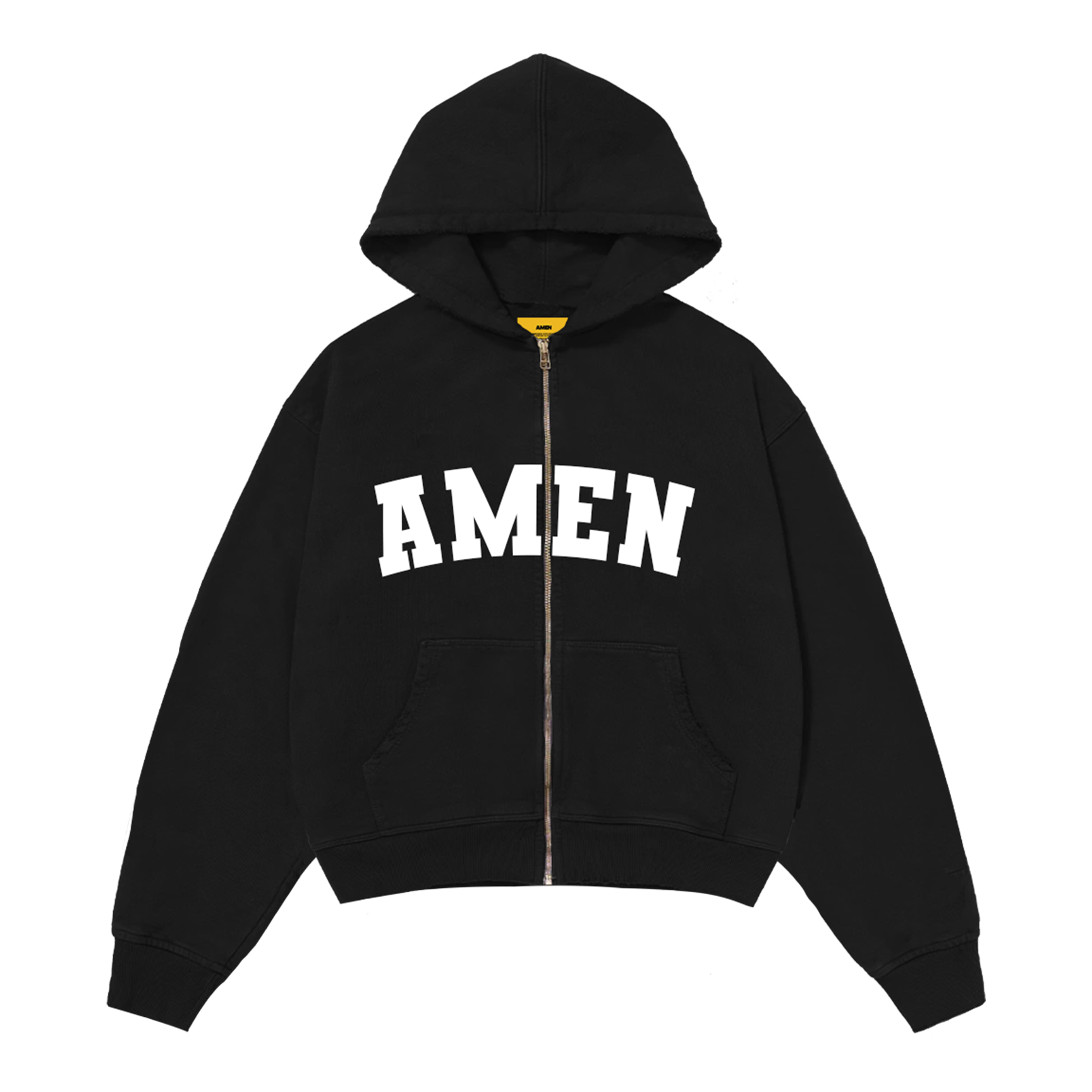 The Amen Zip-Up Sweatshirt is made from 77% cotton, 23% polyester fleece, weighing 355gsm. This sweatshirt features a hand-frayed embroidered patch on the front, featuring a cropped design. It also features haute couture finishing details.