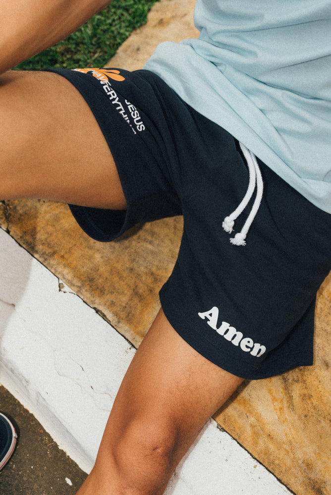 Navy blue shorts with an adjustable elastic waistband and drawstring. Front pockets and no back pockets. Made from soft, heavyweight sweatshirt fabric, with no terrycloth or inner flannel, making it lighter and cooler.